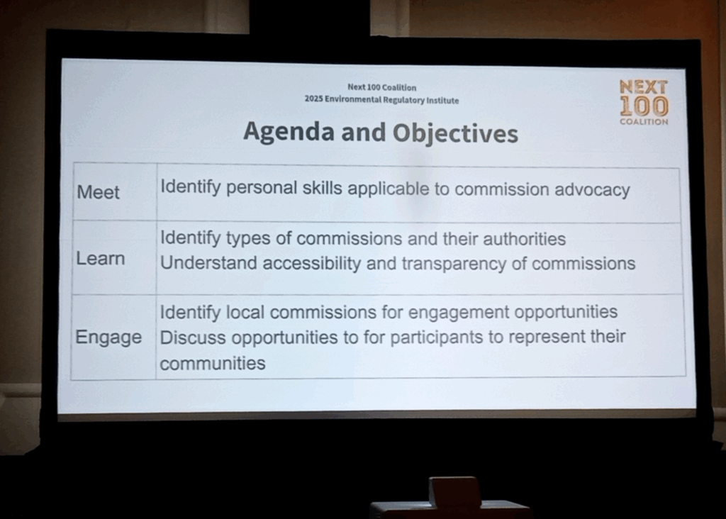 I also attended an informative workshop titled “Represent Your Community: Environmental Commissions 101.” Speakers Jonathan Tyrrell and Karyn Bigelow from the Next 100 Coalition shared facts about environmental commissions that make decisions regarding millions to billions of dollars in local, state, and federal funding, directly impacting outdoor access, public health, and the local environment. However, community representation is often significantly lacking in these spaces.