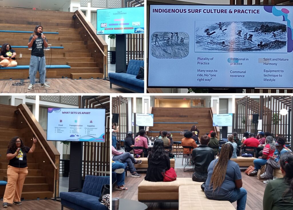 David talked about bringing the joy of surfing to Black Lives Matter activists and reminded us that Indigenous Americans were experts in surfing, using gear made from natural materials. He also highlighted how surfing was part of social, cultural, and community activities, as seen in Hawaii, before being whitewashed by colonizers and transformed into a competitive sport dominated by Westerners.